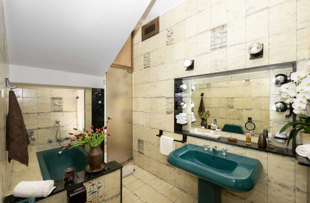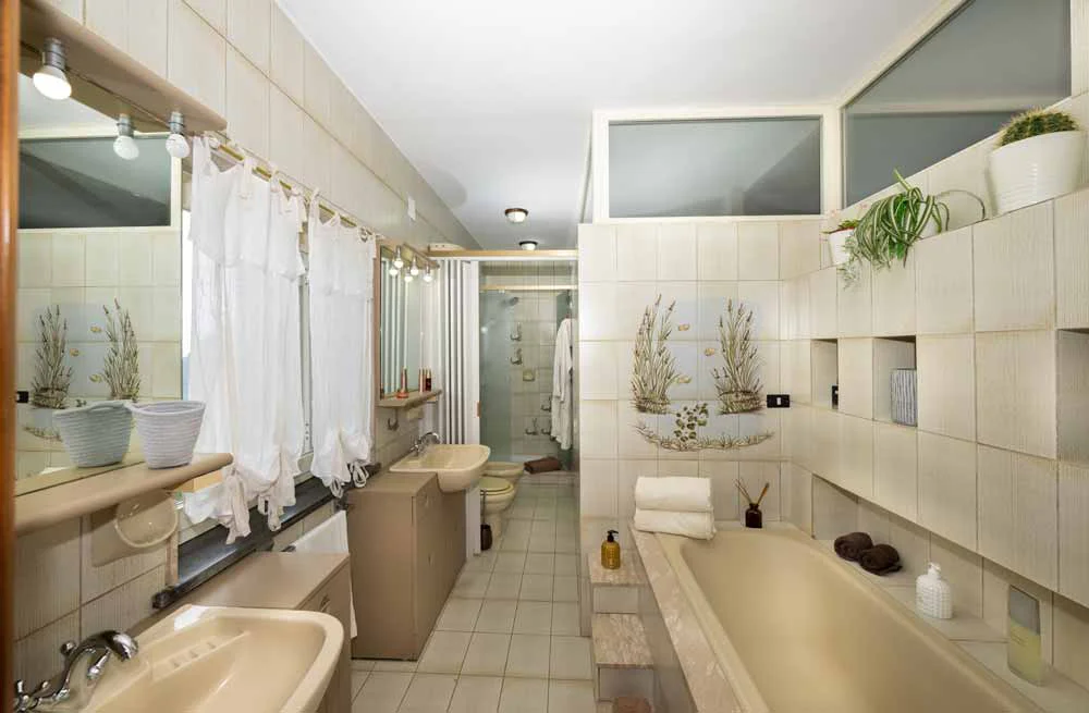 Two refined bathrooms are thoughtfully arranged across both levels, ensuring comfort and convenience throughout the residence. Each bathroom features a bath with shower, bidet, and carefully selected finishes, offering a relaxing and elegant space for everyday rituals.